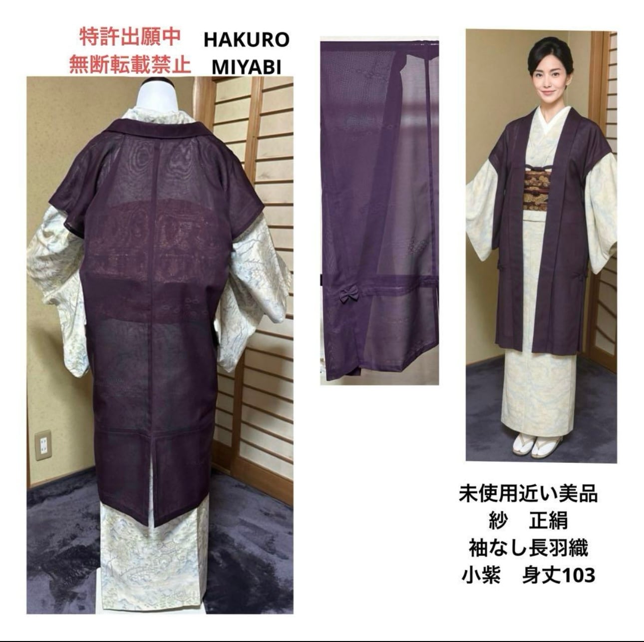 羽織単品 未使用近い 美品 紗 正絹 袖なし長羽織 小紫 身丈103