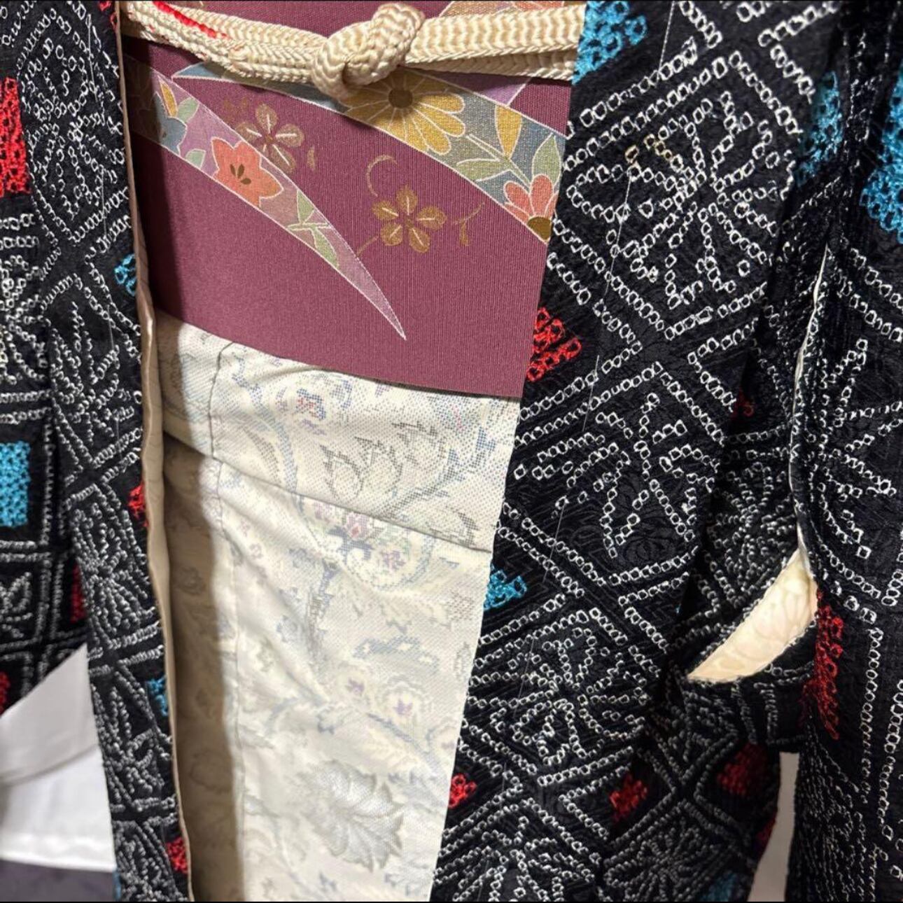 普通丈の総絞り羽織を一級和裁士が長羽織に仕立て直しています。