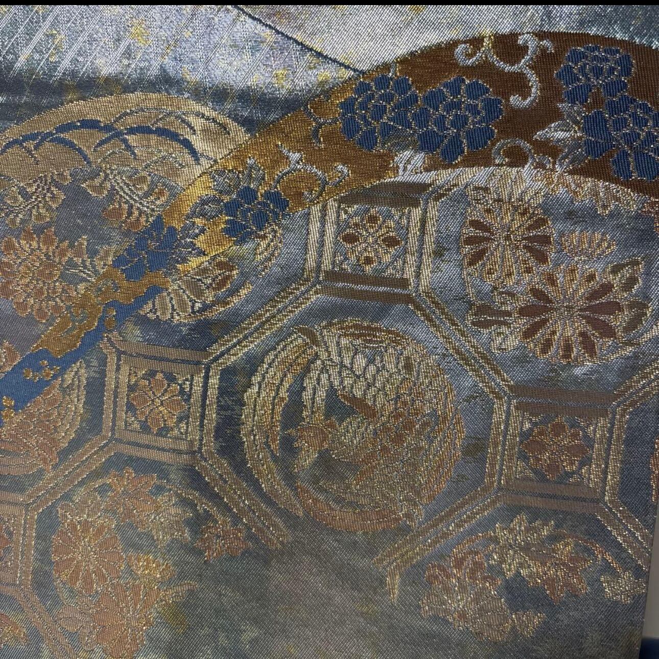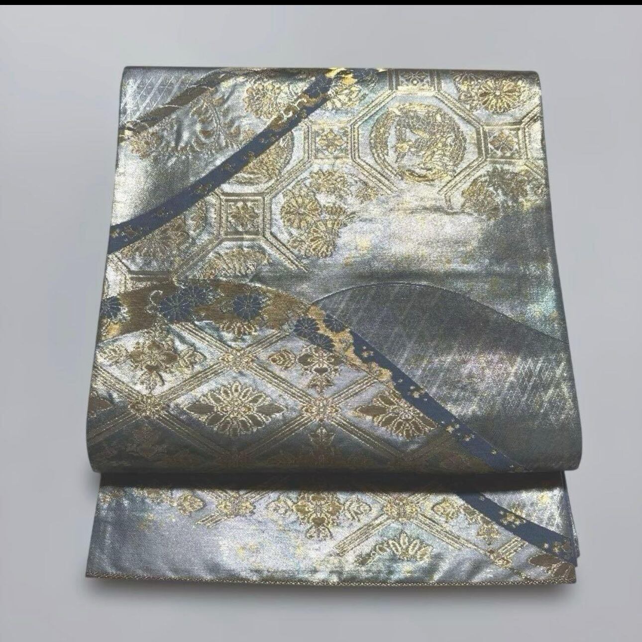 逸品 袋帯 正絹 引き箔 プラチナ箔 銀鼠 青暈し 鳳凰 亀甲華文 六通柄 美品