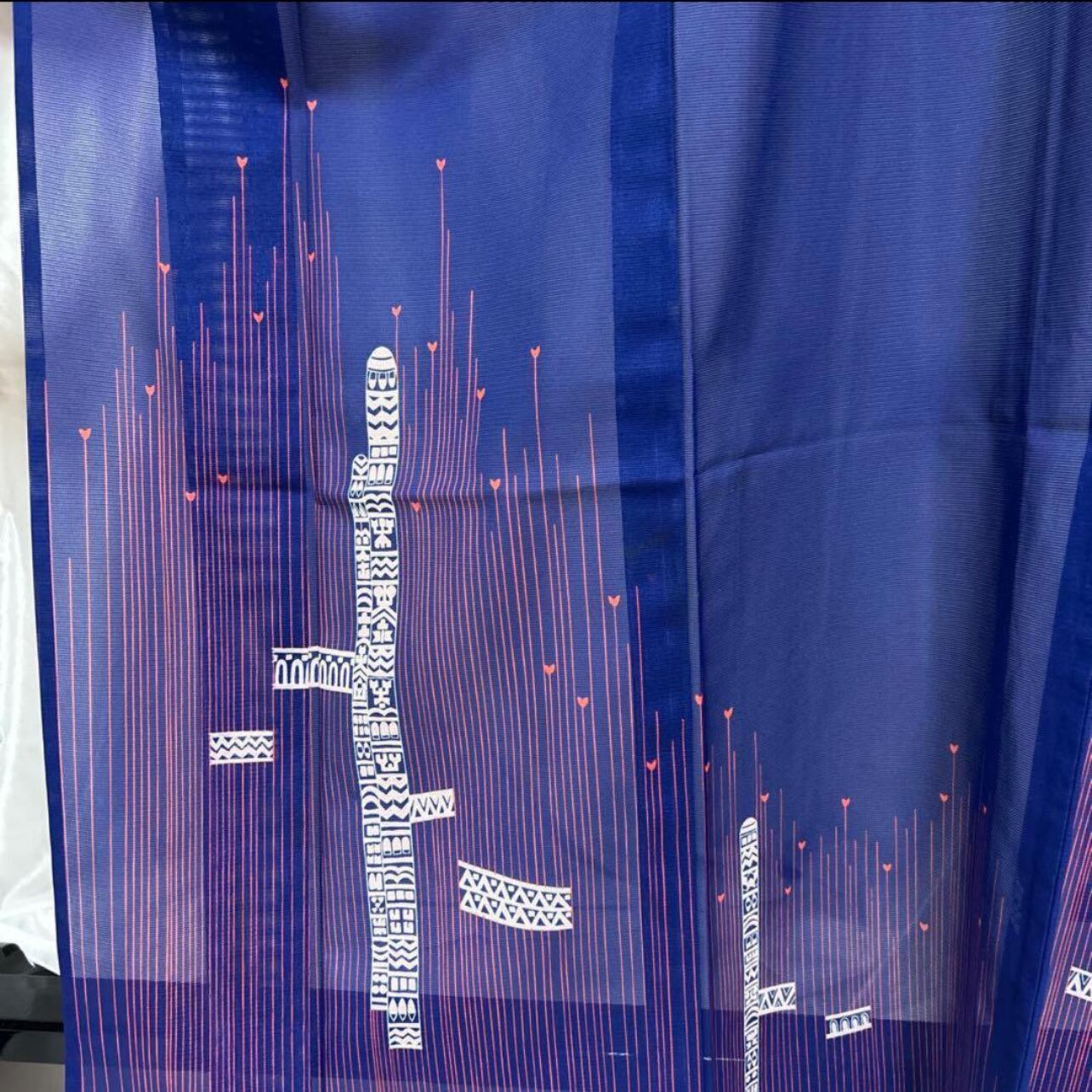 落ち着いたネイビーカラーに、裾の意匠が上品に映える一着。