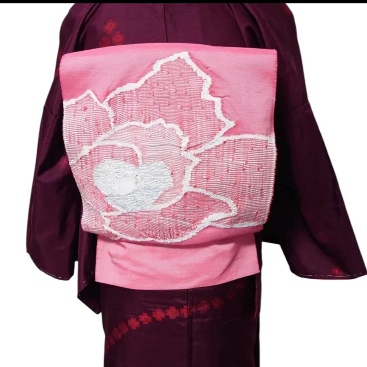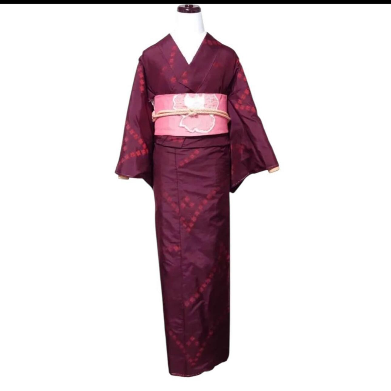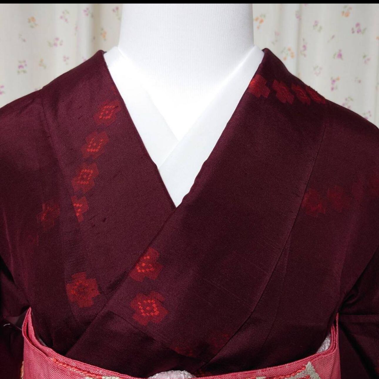 落ち着いた臙脂(えんじ)系の地色に、絣調の文様が全体に配された、上品な佇まいの一枚です。