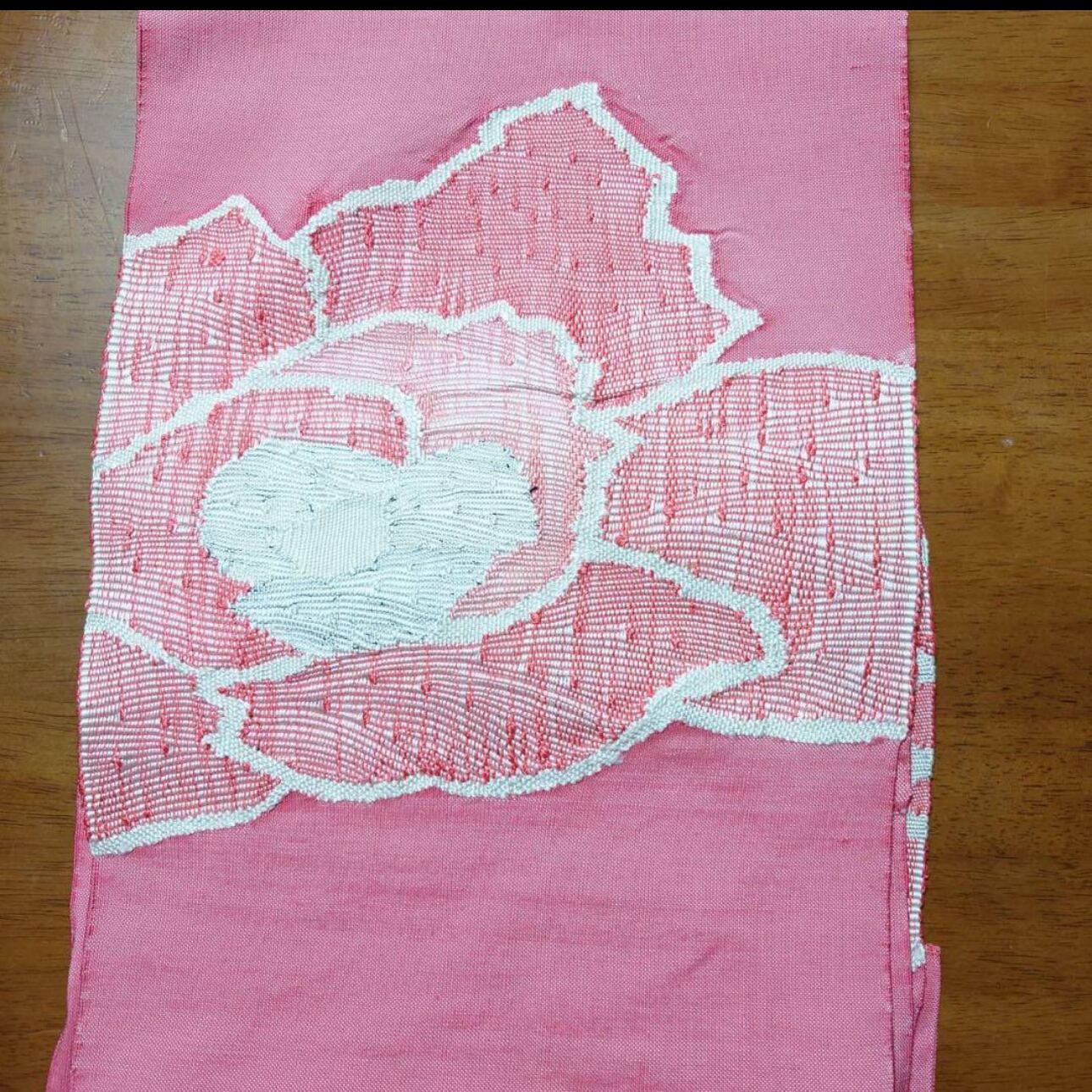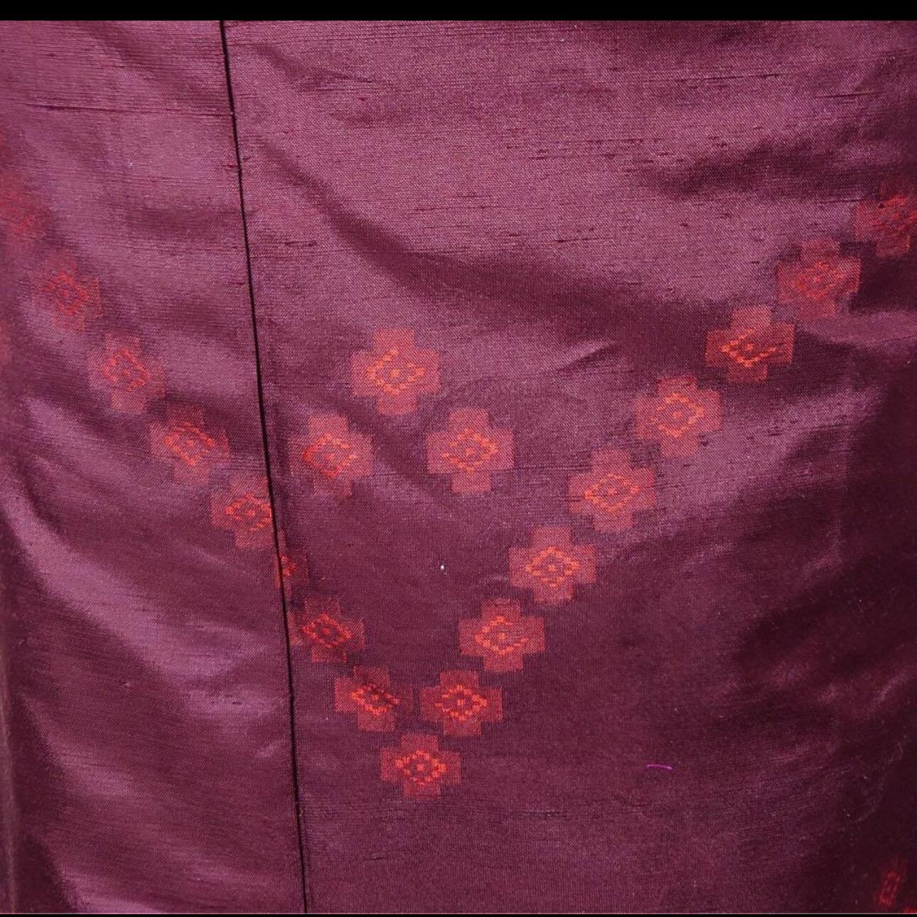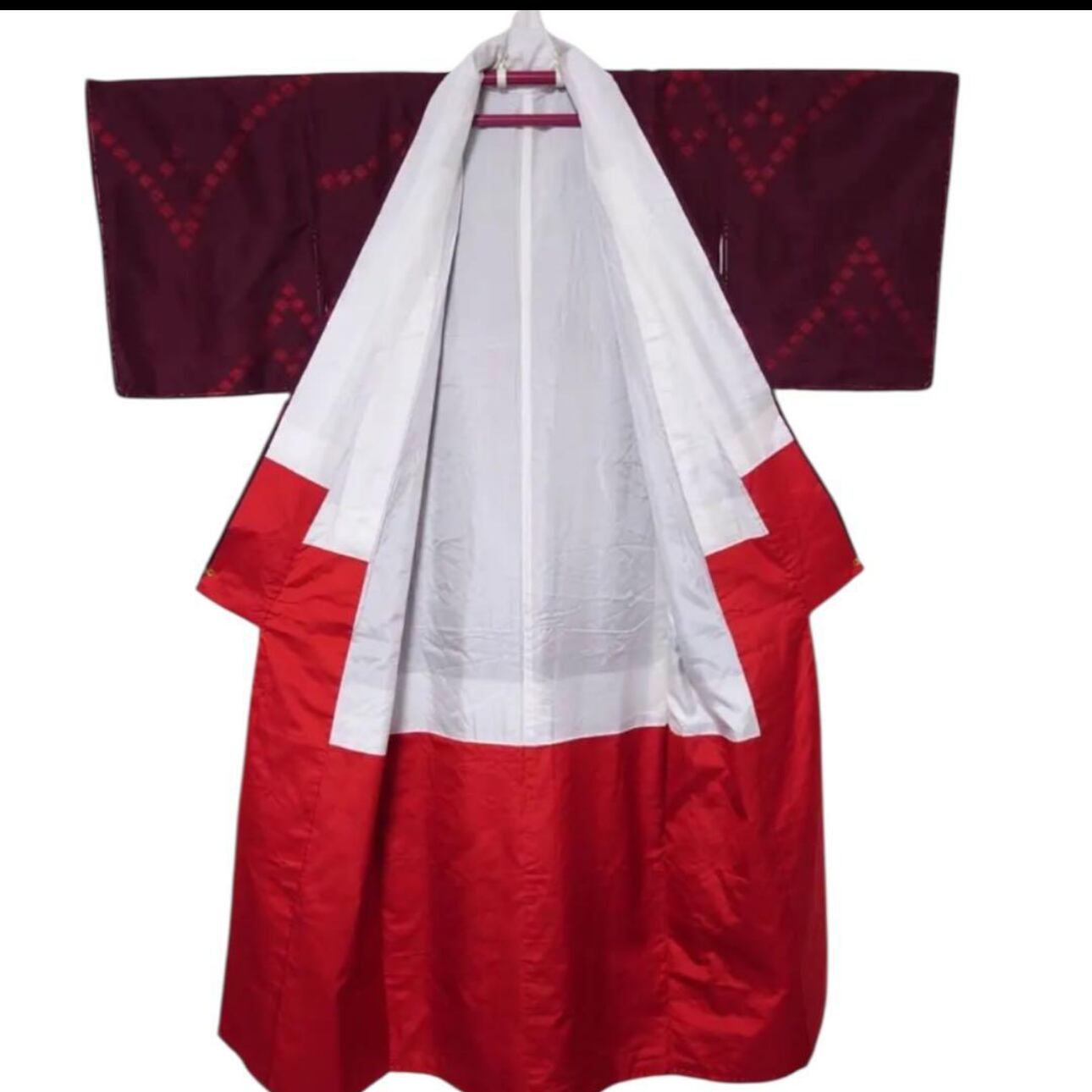 落ち着いた臙脂(えんじ)系の地色に、絣調の文様が全体に配された、上品な佇まいの一枚です。