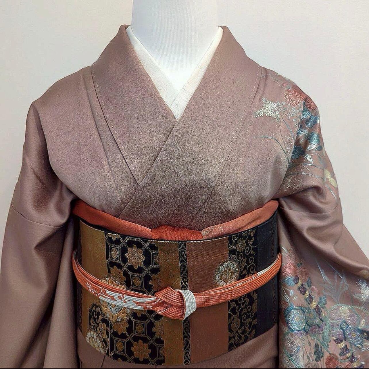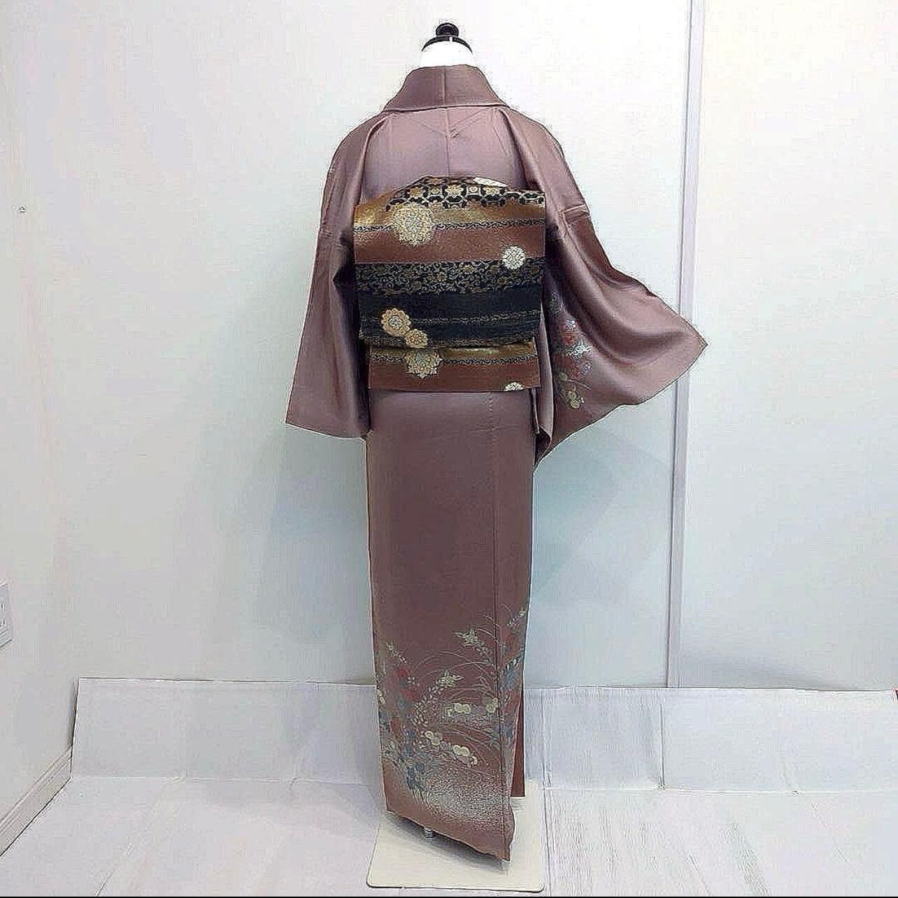 上品な梅鼠のお色味が美しい、正絹訪問着の4点フルセットでございます。