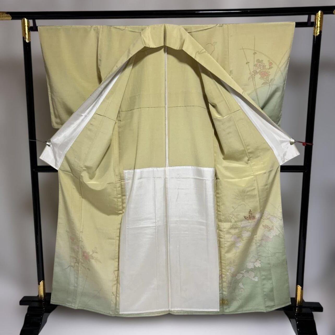 やわらかく品のある女郎花色に、繊細な柄行が美しく映え、落ち着きと華やかさを兼ね備えた装いです。