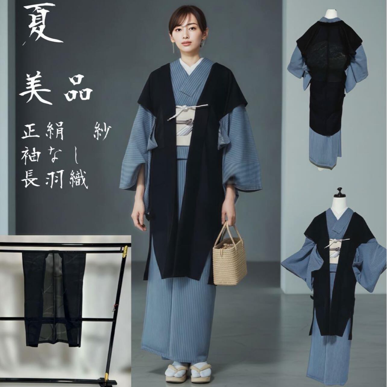 夏羽織 薄物 長羽織 羽織 正絹 絽 袖なし羽織 新品羽織紐付き カタ3-7